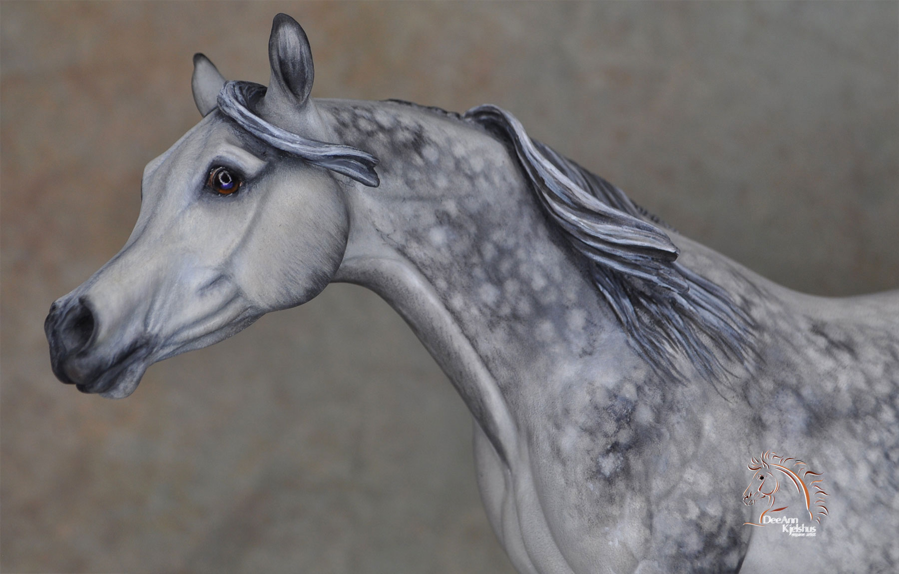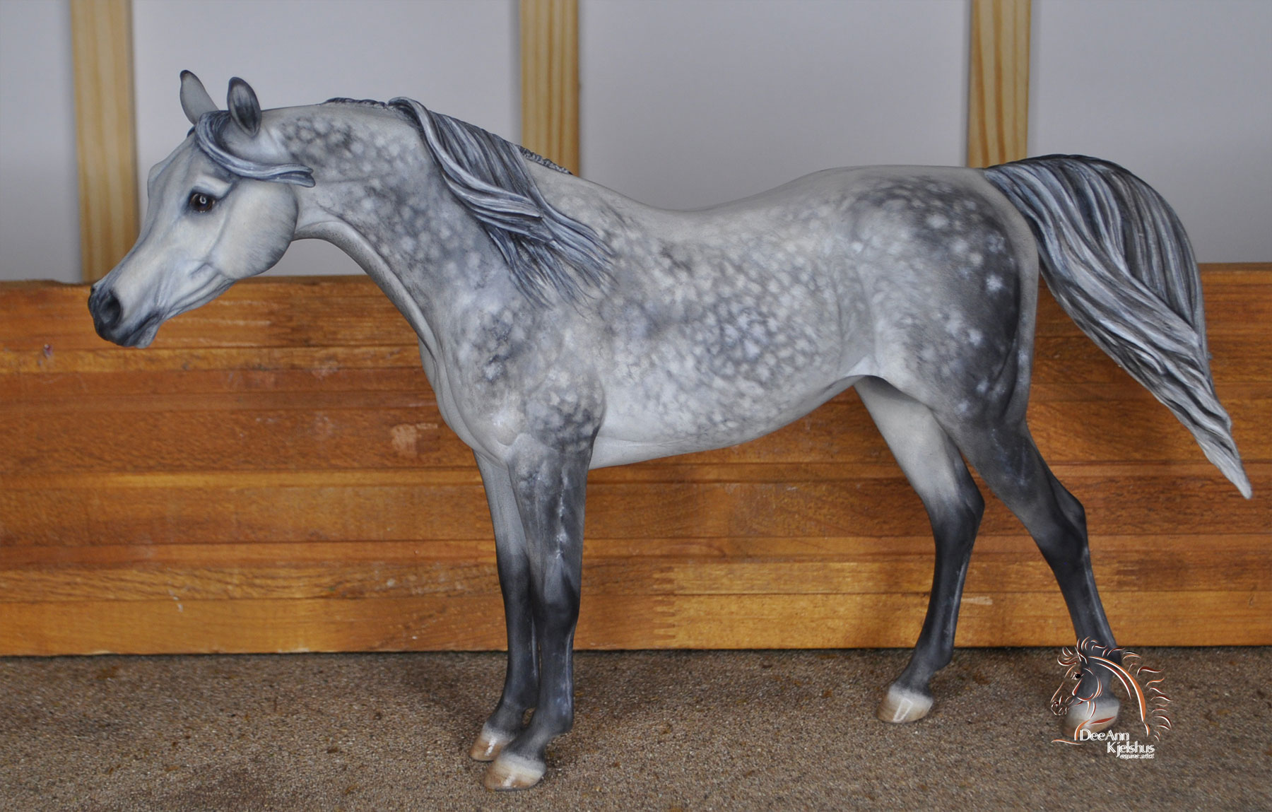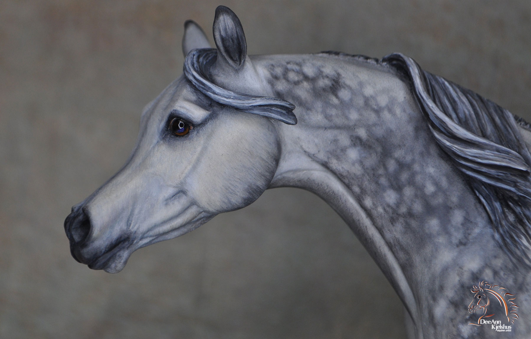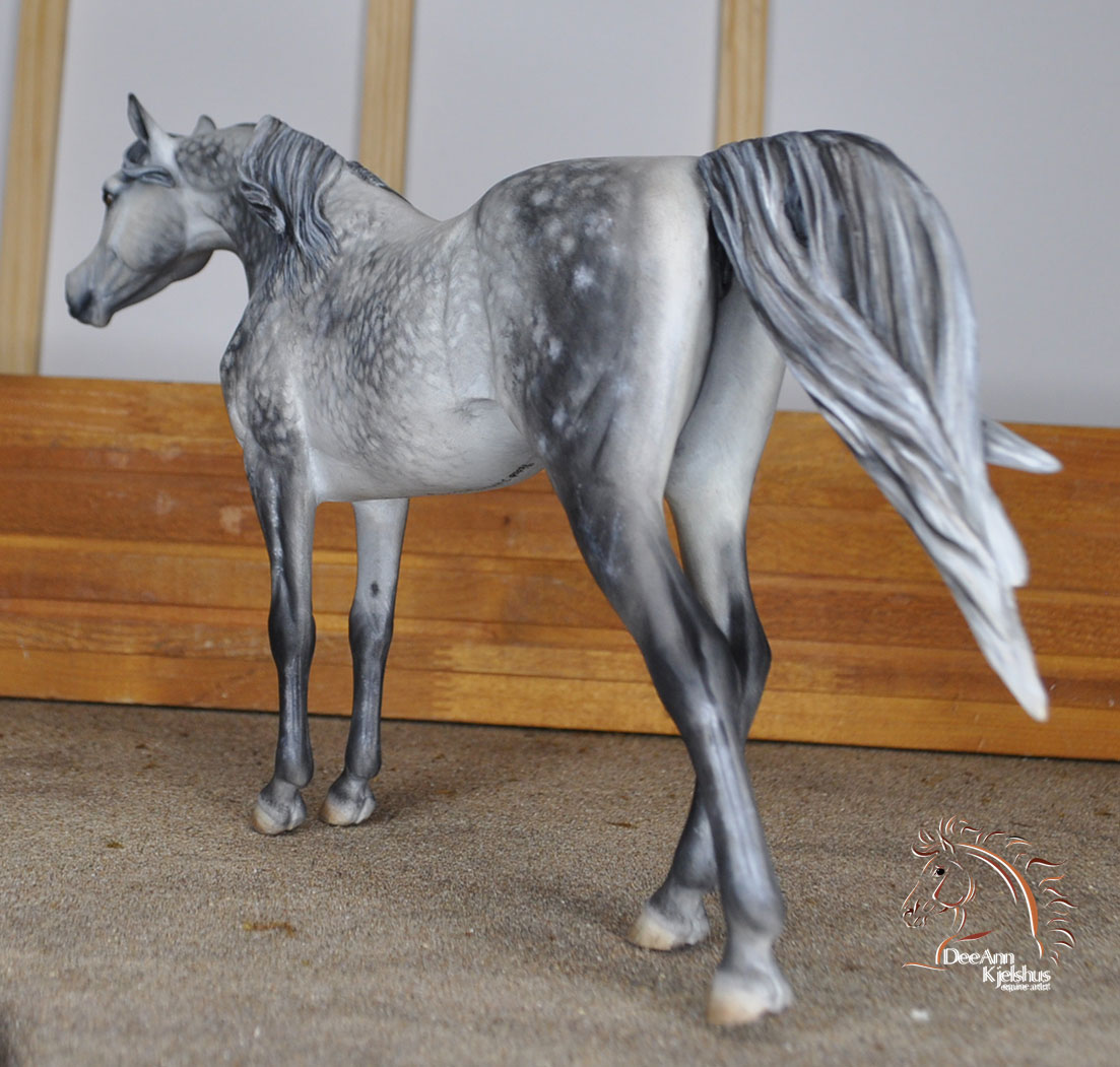 Graphyte is a Sumara Arabian mare resin sculpted by Sommer Prosser and painted by DeeAnn Kjelshus. Graphyte is painted in artist quality pastels, acrylic paints and colored pencils into a lovely dappled grey. She has a slightly cusotmized tail that was made a tad thinner and shorter. She was originally finished in 2020. I never felt like she was really "done", so I picked her back up and started painting again in 2023, making her a darker dappled grey. Now I feel like she's found her true color. She has tons of details including hooves that are made to look sculpted even though only one of them is sculpted, the other 3 are flat. Some hair by hair used throughout to give the coat depth and detail, including her face.
