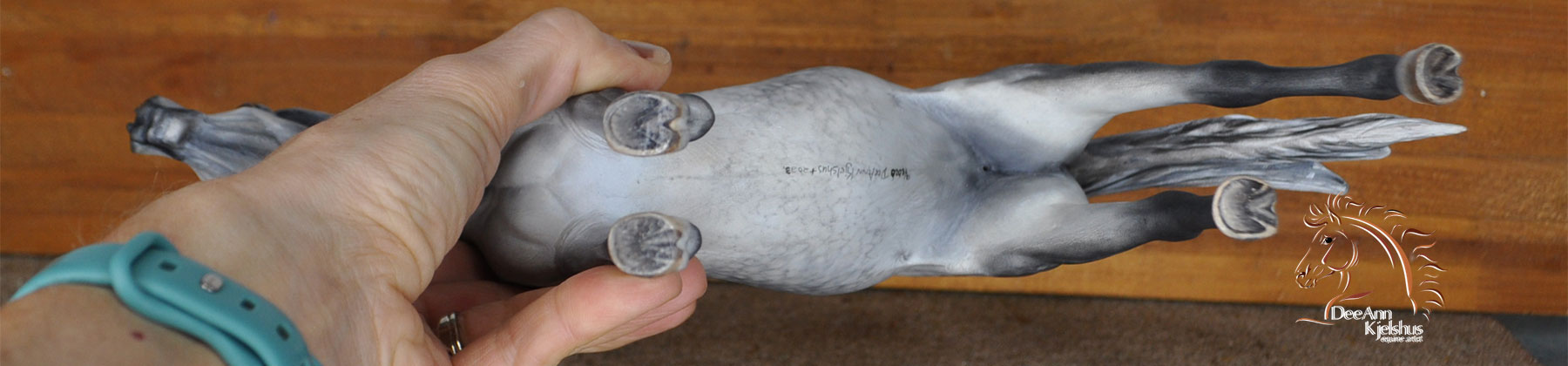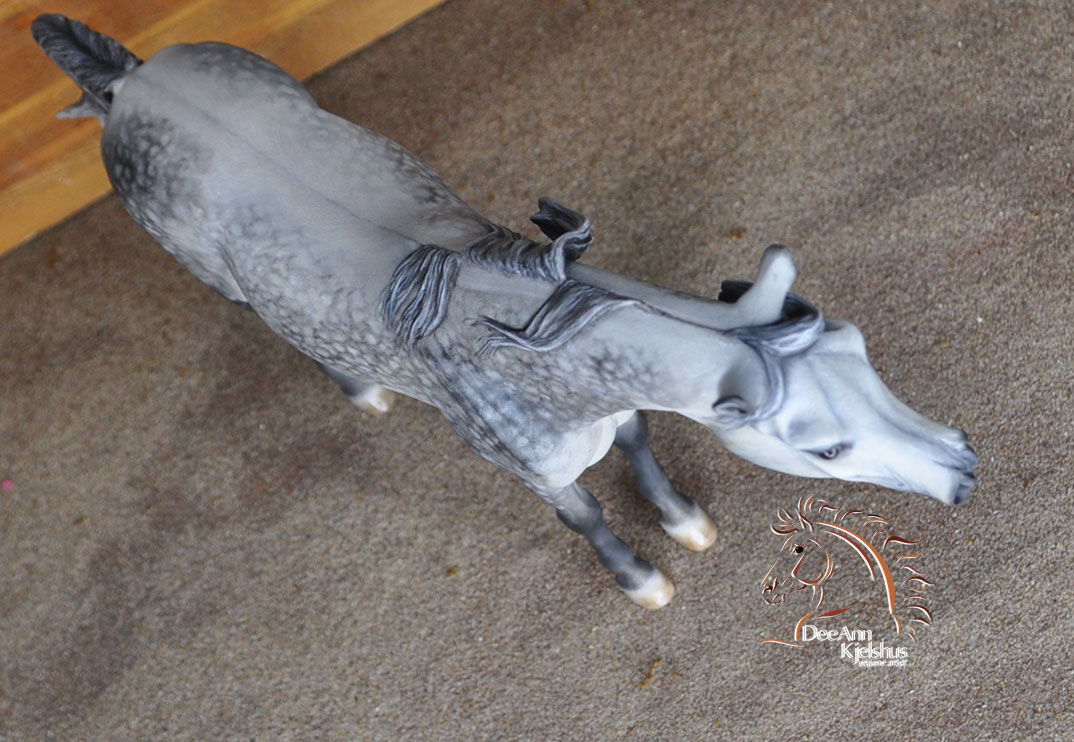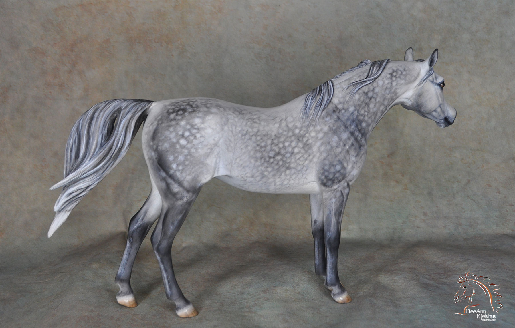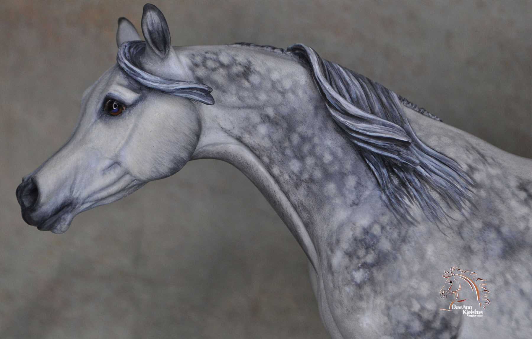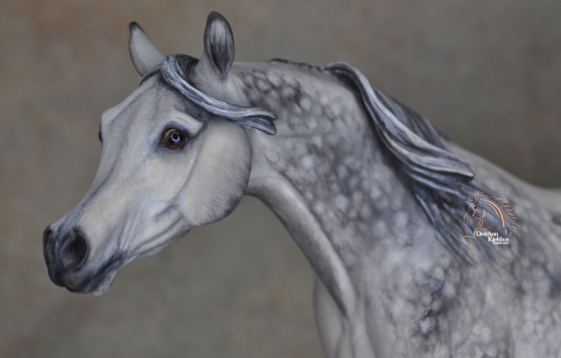 Graphyte is a Sumara Arabian mare resin sculpted by Sommer Prosser and painted by DeeAnn Kjelshus. Graphyte is painted in artist quality pastels, acrylic paints and colored pencils into a lovely dappled grey. She has a slightly cusotmized tail that was made a tad thinner and shorter. She was originally finished in 2020. I never felt like she was really "done", so I picked her back up and started painting again in 2023, making her a darker dappled grey. Now I feel like she's found her true color. She has tons of details including hooves that are made to look sculpted even though only one of them is sculpted, the other 3 are flat. Some hair by hair used throughout to give the coat depth and detail, including her face.